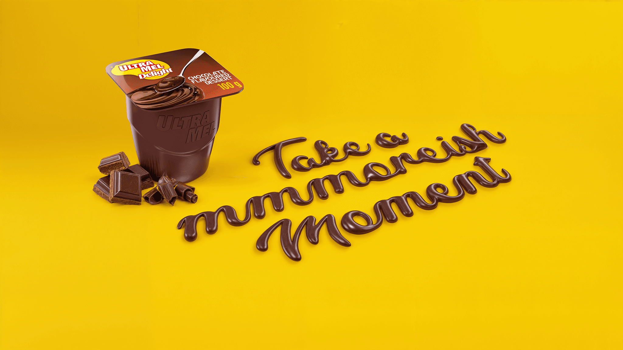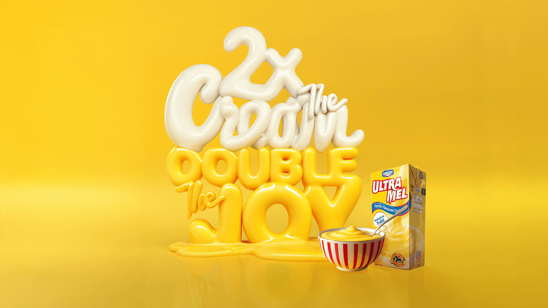 The central theme of "Double the Joy" is brought to life through a custom 3D typography treatment, where the words appear thick, glossy, and melting—mirroring the smooth consistency of the custard itself. The choice of an all-yellow color palette reinforces the product’s identity, creating a warm and inviting atmosphere.